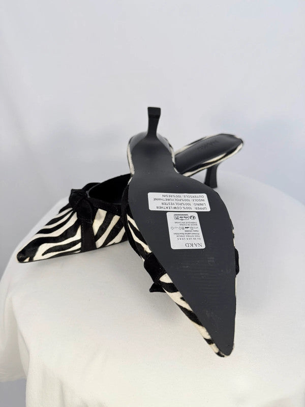 Chaussures mule à bout pointu en cuir imprimé zèbre, nœud velours noir sur le dessus. Talon bottier de 4 cm, semelle intérieure matelassée.