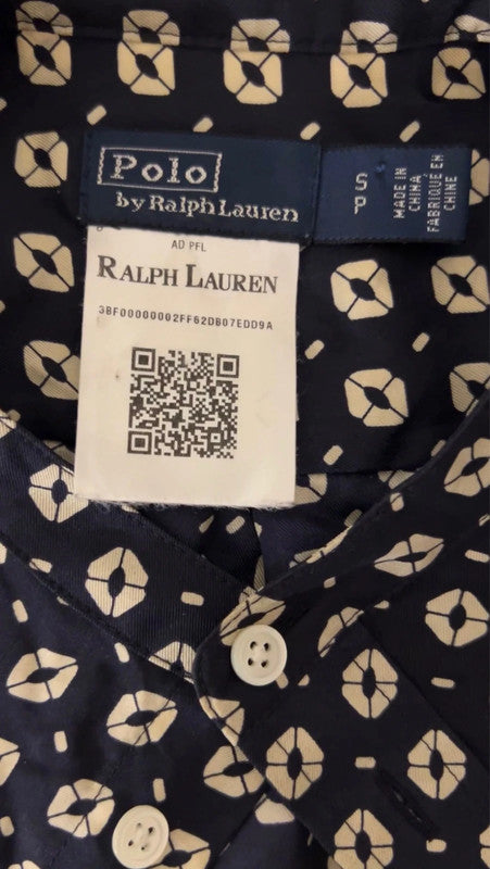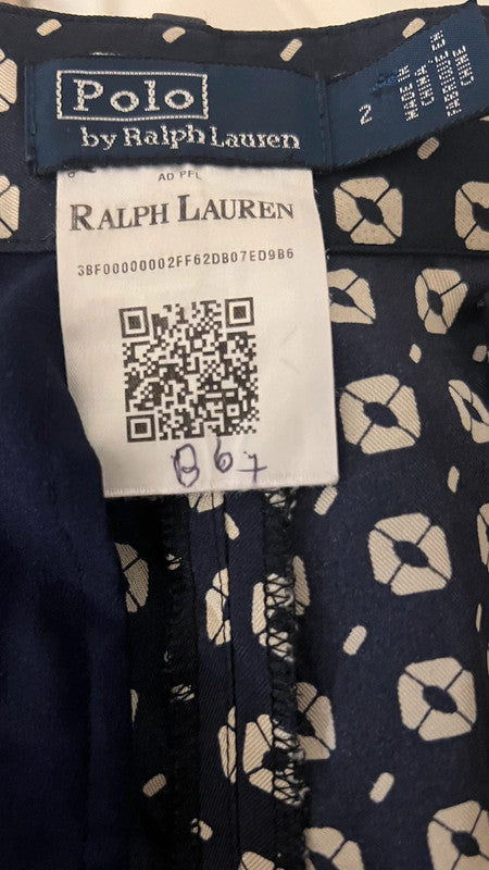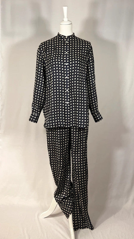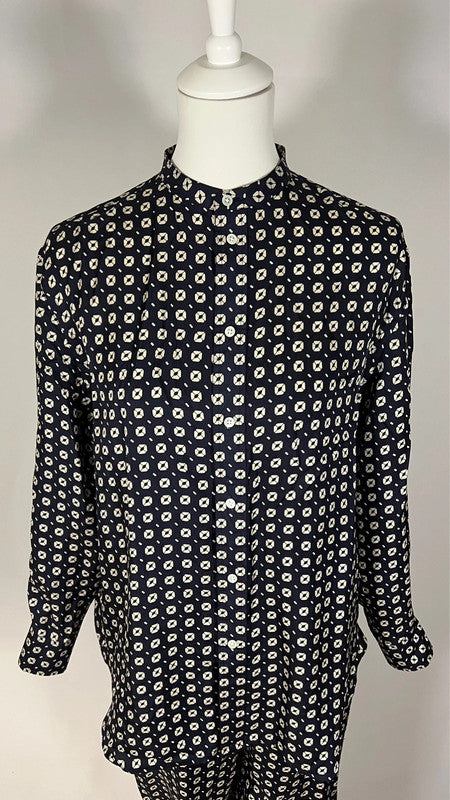 Chemise et pantalon droit, imprimé géométrique en bleu marine et blanc. Taille plutôt ample.