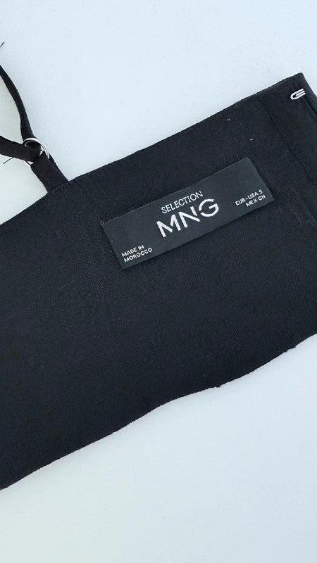 Bustier court en tissu stretch noir, armatures légères et bonnets moulés intégrés. Dos fermé par agrafage trois positions, bretelles amovibles.