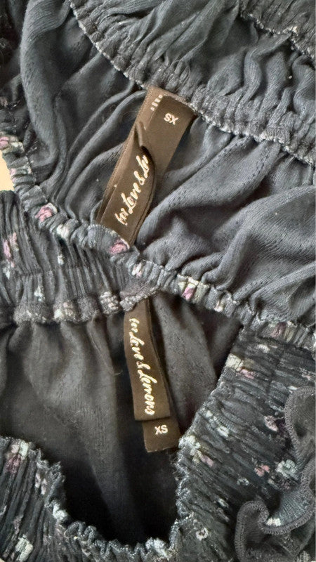 Top court à manches ballon et encolure fron-cée, monté sur élastique avec petit nœud orné d'une rose. Short assorti taille haute à volants de broderie et nœud central, Coton fin et fluide motif fleuri délicat.