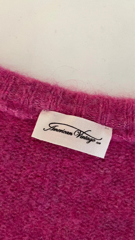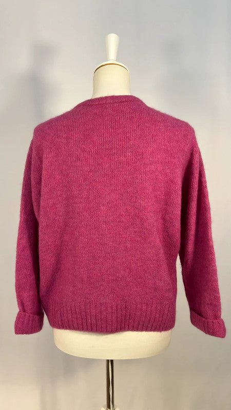 Gilet/Cardigan en mohair rose fuchsia. Col en V, coupe droite, boutonnage classique avec jolis boutons nacrés. Légèrement oversize.