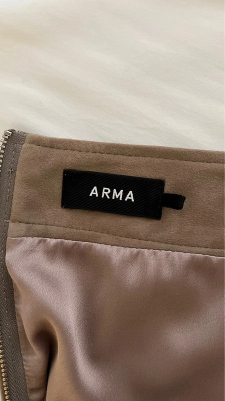 Jupe en suède façon daim marron, coupe légèrement évasée. Tissu doux et épais, très agréable à porter.