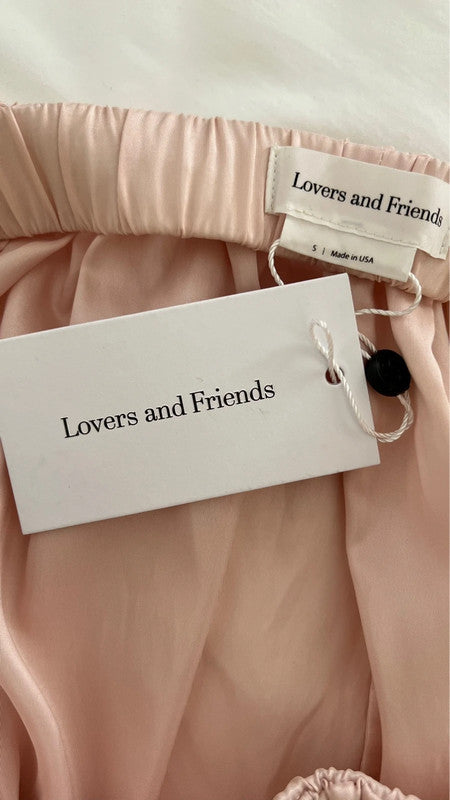 Jupe longue rose poudrée en satin, coupe évasée avec beaucoup d’ampleur et tombé fluide. Très élégante.