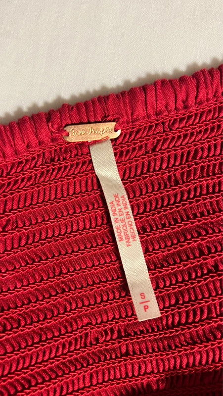Robe bustier rouge courte, bretelles larges effet plissé, jupe évasée. Taille ajustée et coupe flatteuse, pour une silhouette élégante.