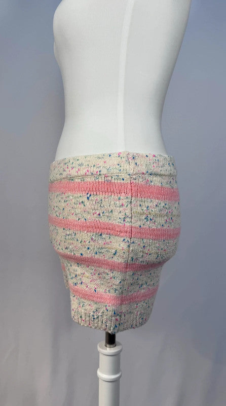 Short en tricot à rayures rose et fond chiné blanc cassé. Taille élastique, coupe près du corps. Confortable et doux, parfait en intérieur ou pour une tenue cosy.