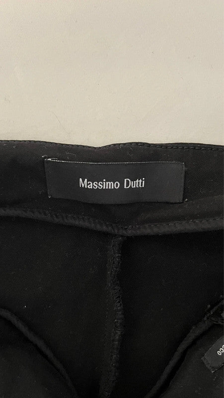 Pantalon flare stretch noir taille moyenne élastiquée, coupe droite et fluide à pince. Plis sur le devant, bas légèrement long. Minimaliste et structuré.