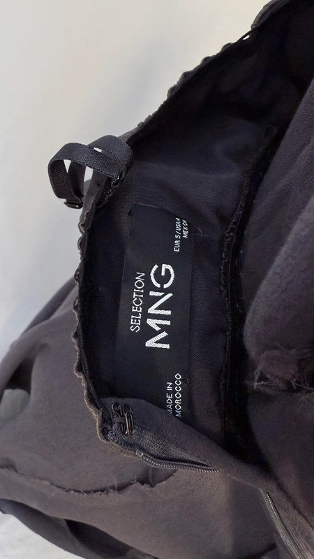 Robe longue noire/grise à bretelles larges, matière fluide et légère. Haut structuré avec bande satinée sur la poitrine, le reste robe en drapé souple.