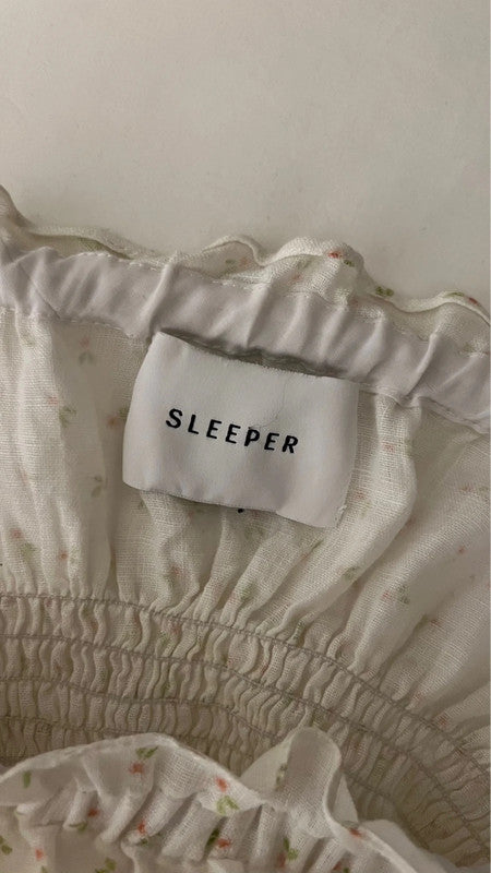 Robe en lin midi blanche en lin Michelin Daily, à petits imprimés floraux, smocks sur le buste, manches longues élastiquées pouvant se porter sur les épaules ou tombantes (pour avoir les épaules dénudées).