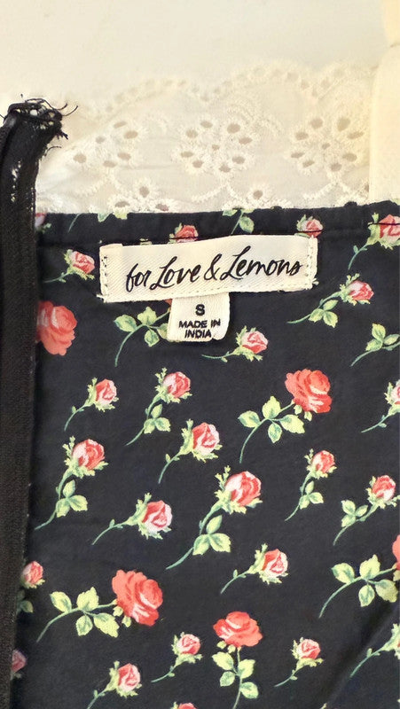 Robe mini Camille noire fleurie ajustée à imprimé micro-roses rouges et vertes. Encolure droite bordée de dentelle blanche, bretelles larges en broderie anglaise.