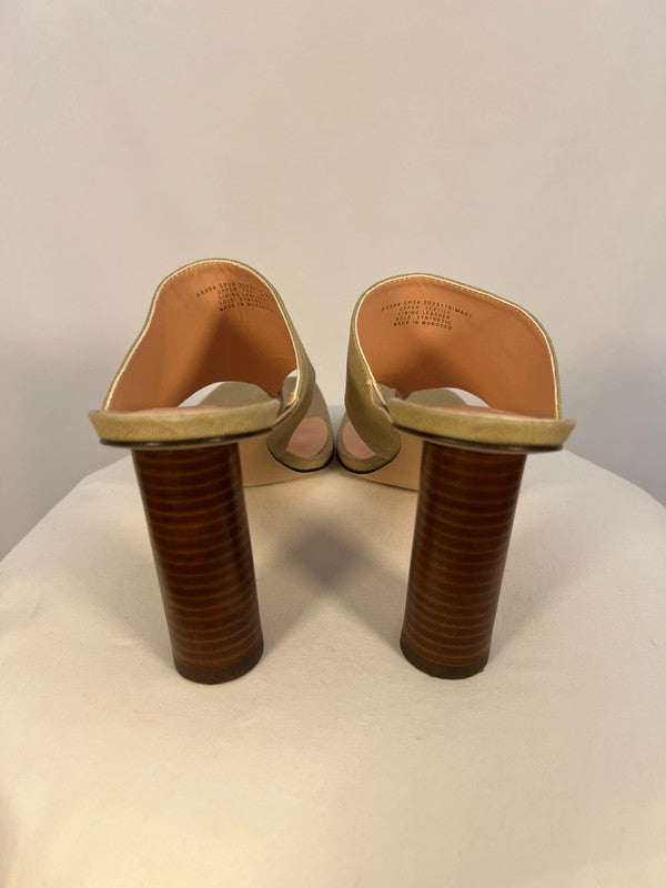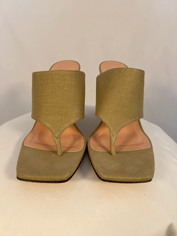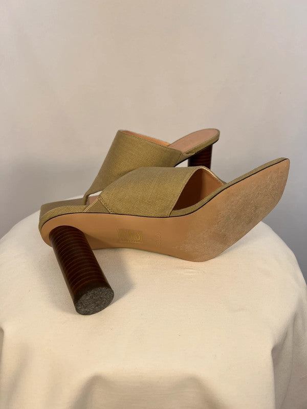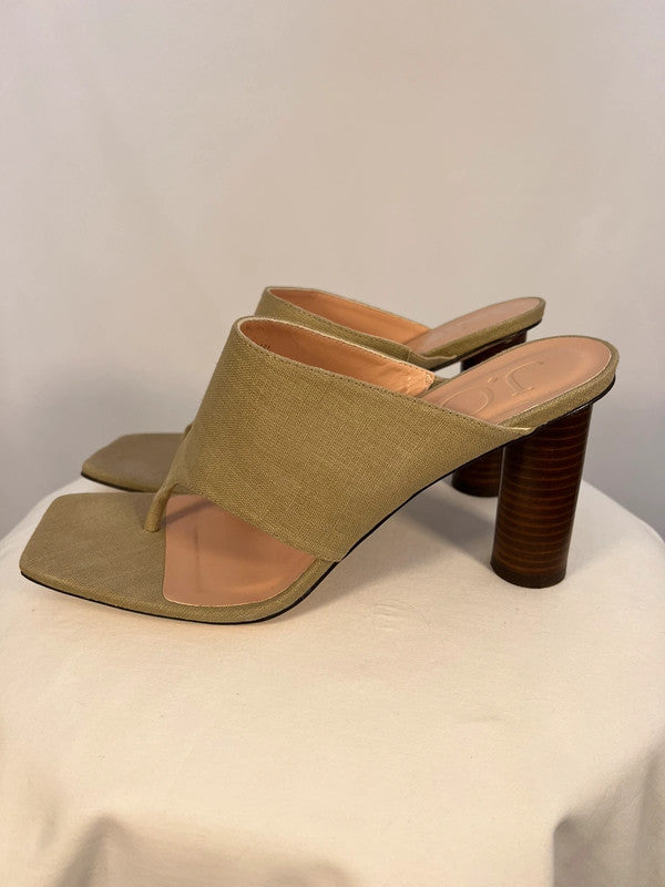 Sandales à talons rond en lin kaki/beige.