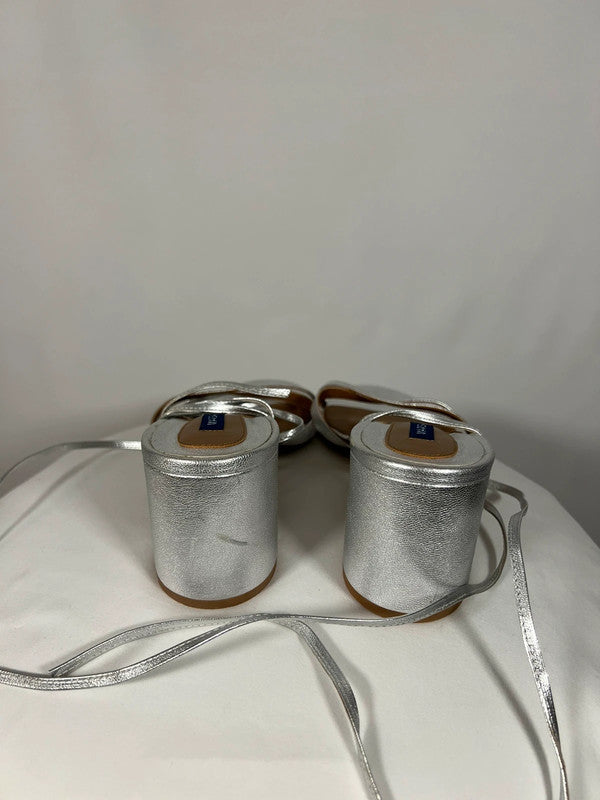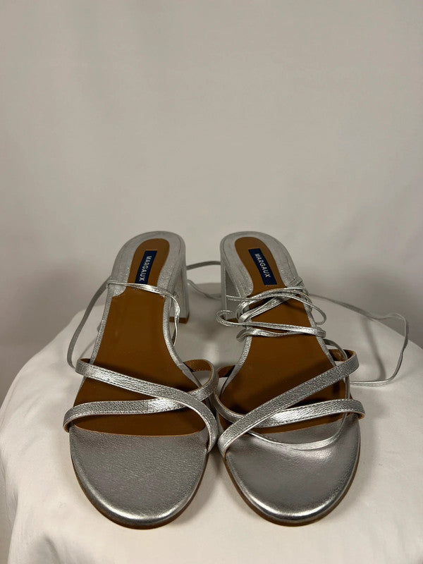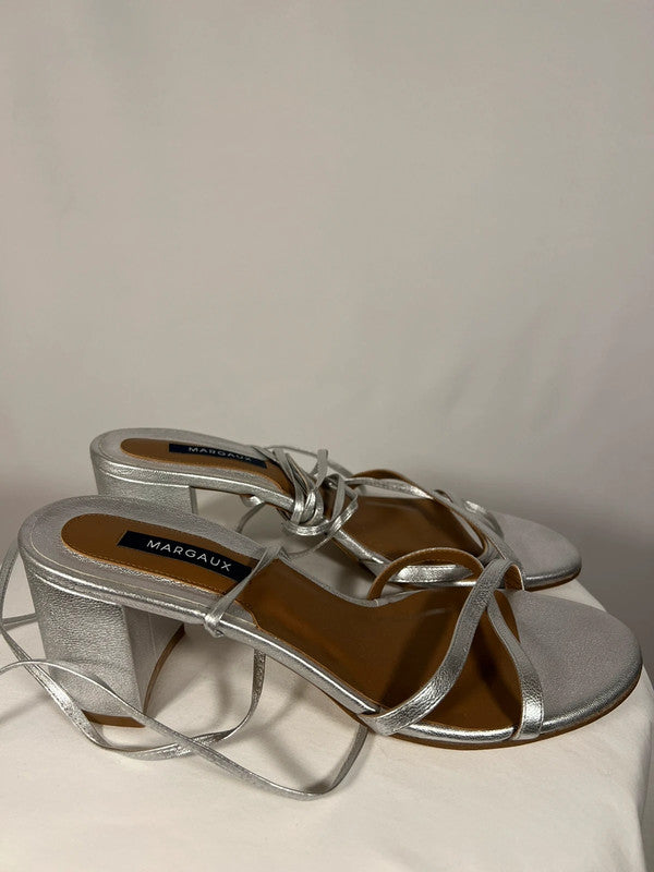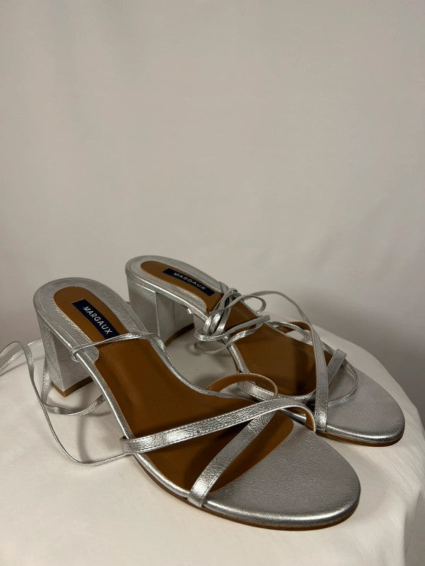 Sandales à talons The Soho de la marque Margaux argenté (silver nappa), avec des ficelles permettant de les nouer autour de la cheville.